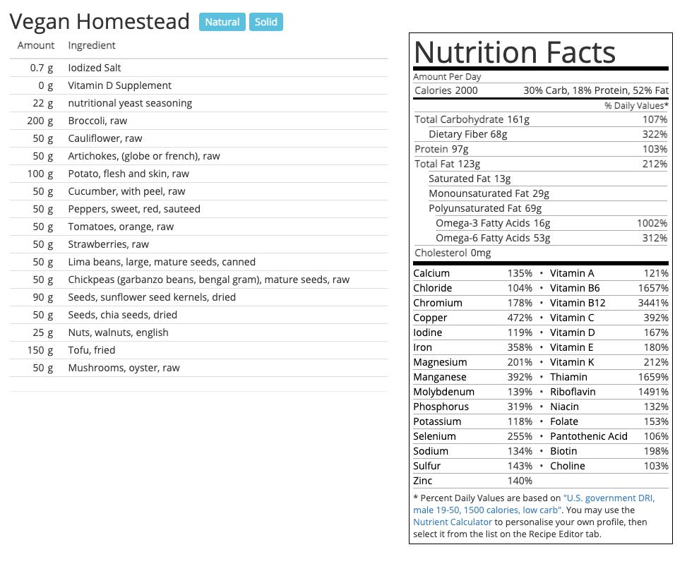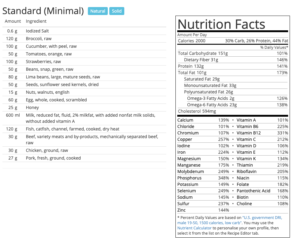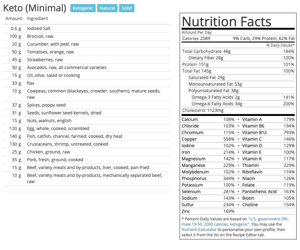 The keto diet was the hardest to find ingredients for to get all the fiber and micronutrients while staying under the targeted carbohydrate intake. That is why it includes ingredients such as flax (for fiber), beef liver (for molybdenum), and poppy seeds (for vitamin E, calcium, and potassium). The keto diet was the only diet where I could not figure out how to get under about 2000 calories after a reasonable amount of effort expended.