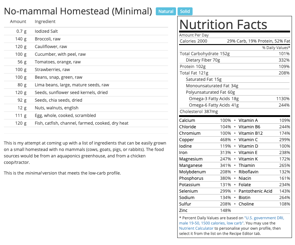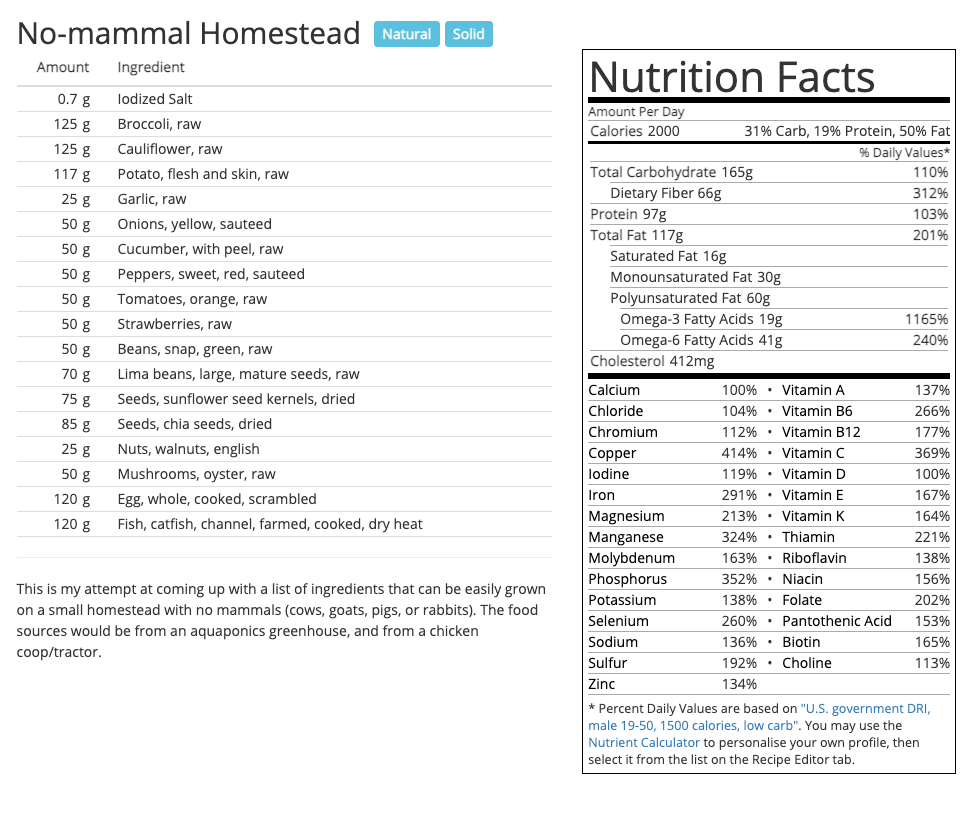 The initial recipe I came up with was one that assumed food grown on a homestead where no mammals were raised for food. Since there are fish on the list, it can be considered a pescatarian diet.